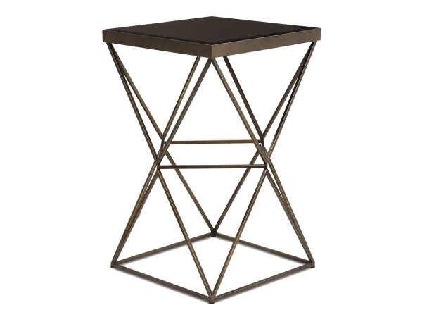 Featuring a modern geometric style base in antique bronze finished steel, topped with beveled black tempered glass.