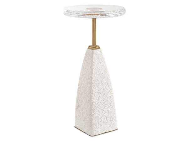 The Sora drink table features a thick seeded glass top with a complimenting white sandstone base and brushed brass stainless