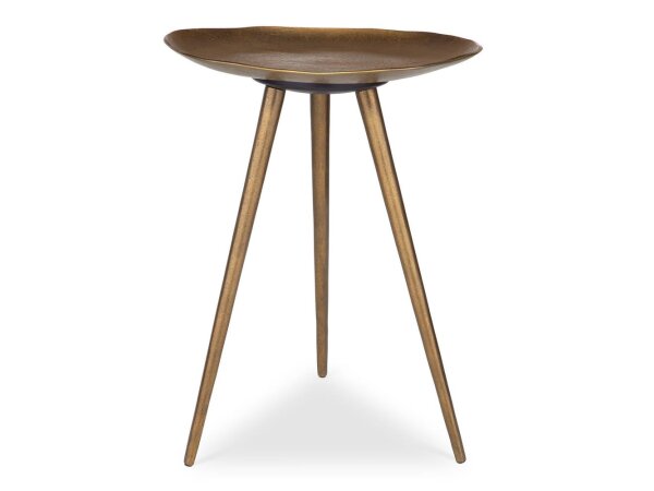 This unique accent table is made from cast aluminum in an antique brass finish. The three slender legs extending outward