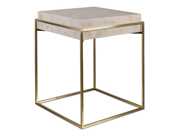 This clean modern accent table showcases an inset ivory burl veneer top supported by a sleek brushed brass plated stainless