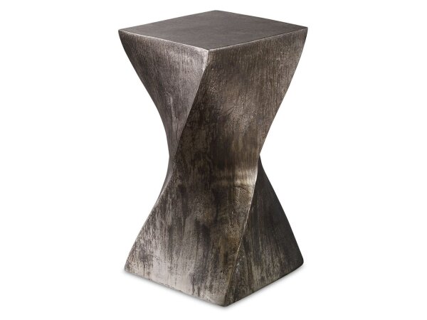 Featuring a unique twisted hourglass shape, this cast textured aluminum table is finished in a heavily tarnished silver with oxidized