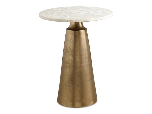Built from cast aluminum in an antique brass finish and a complimentary travertine top. No matter where this table is