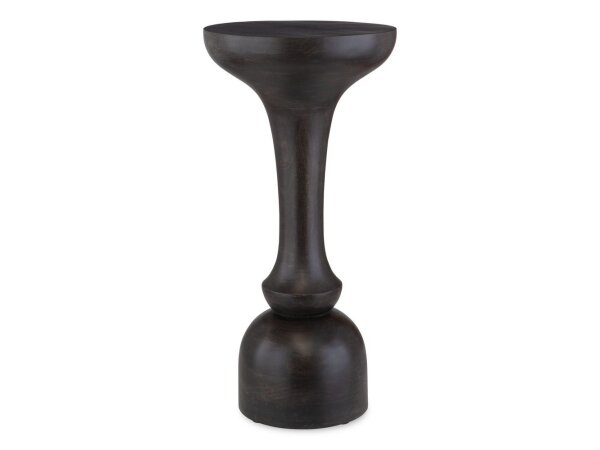 Crafted from mango wood, this accent table boasts a rich black finish and a distinctive hourglass base with flowing curves.