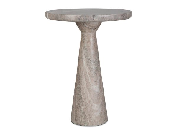 Crafted entirely from white marble with soft gray veining, this table embodies sophistication and minimalism. Its smooth, tapered pedestal base