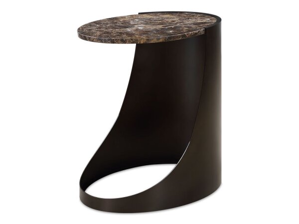 This side table features a sleek black metal base with a distinctive sculptural form that enhances both visual interest and