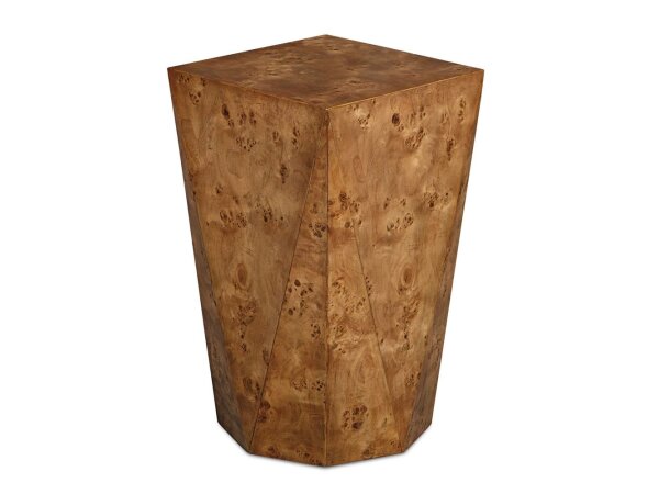 This accent table showcases a captivating geometric design with angled, faceted sides that beautifully accentuate the rich patterns and intricate