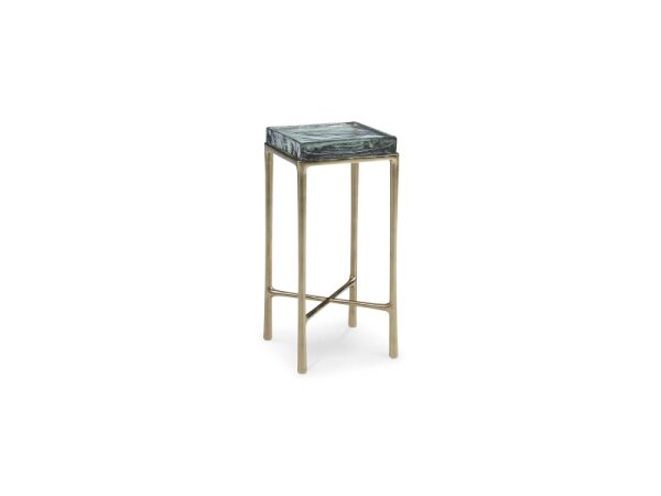 Side table with a gold-finish cast aluminum base and 2 in. thick cast glass top with artisanal texture. Compact 11.6 in. W x 11.6 in. D x 24.6 in. H.