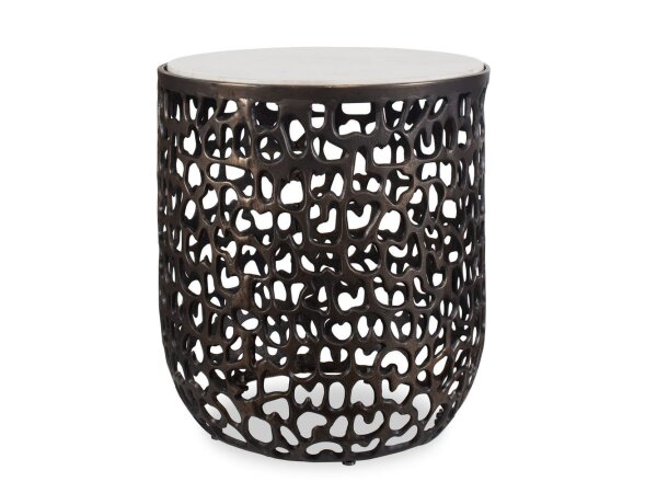 This striking accent table boasts a sculptural form crafted from cast aluminum. The sandy texture, organic shape of the base,
