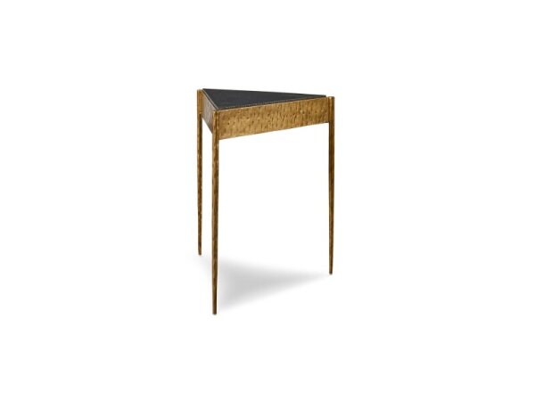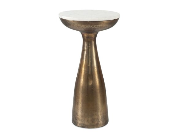 Compact drink table with a textured, starburst‑patterned aluminum top in antique gold and a walnut‑finished mango wood stem. 25.2 in. H x 13.8 in. W x 13.8 in. D.