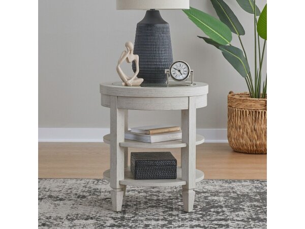 Crafted from poplar solids and white oak veneers with a weathered bisque finish, this chair side table features a fancy face veneer top and a storage drawer. It includes a door with an antiqued mirror and an adjustable wood shelf for versatile storage.