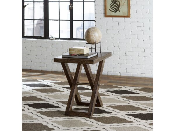 Crafted from rubberwood solids and wire-brushed white oak veneers with a Russet Brown finish, this chairside table features an X-style open leg base and metal stretcher for an urban industrial look.
