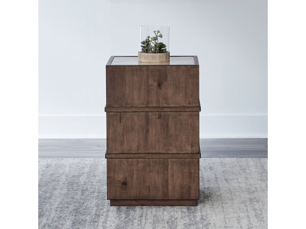 This Skyview Lodge round chairside table features a tempered glass top over an X-reclaimed panel, supported by an architecturally styled pedestal base. It is crafted from Rubberwood solids and White Oak veneers with a Cobblestone finish.