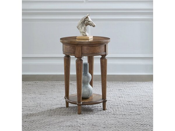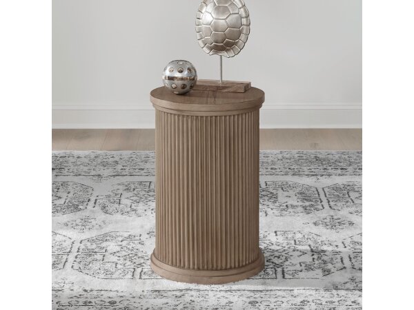 This round chairside table features a distinct cylinder-shaped base with reeded accents. The design is grounded by a step base molding for a clean, classic look.
