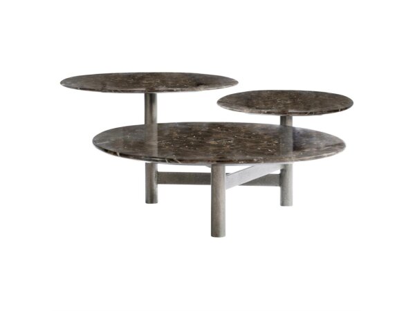 Cocktail table with a dark charcoal textured metal frame and X-stretcher topped by a creamy beige marble slab. A versatile coffee table that blends easily with transitional decor.