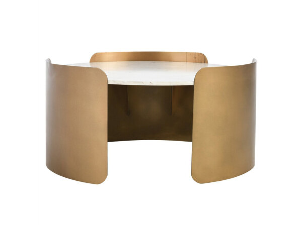 Round cocktail table with acacia veneer top and shelf featuring a starburst pattern. A golden-brown textured metal frame complements the medium natural wood finish.