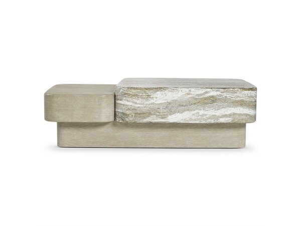 Monolithic forms and organic materials are stacked and shaped for a sophisticated cocktail table.