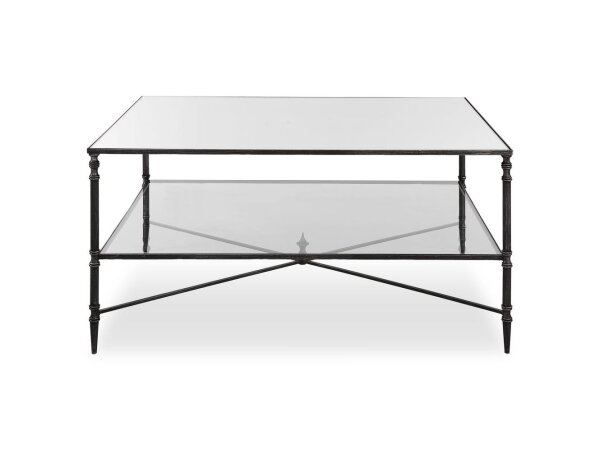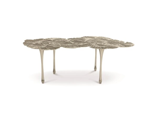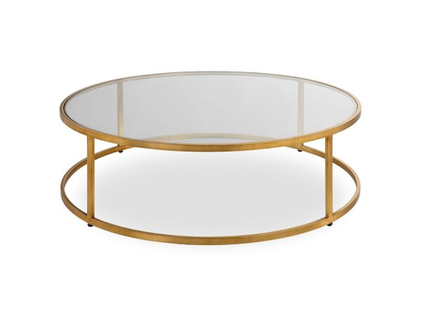 Coffee table with reverse-painted tempered glass top featuring handpainted gold-colored koi. Wood and glass construction with a champagne-gold metal frame.
