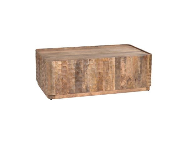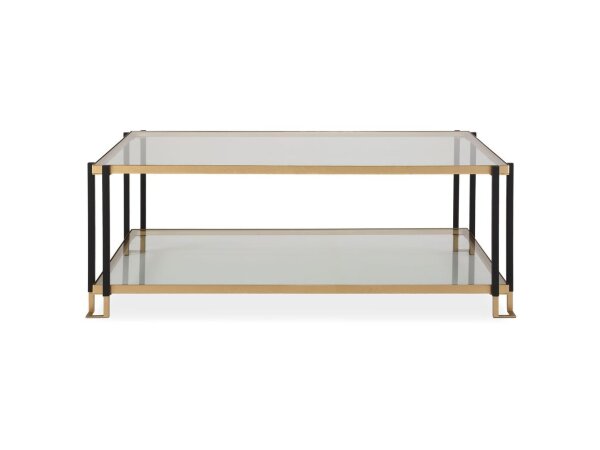 Rectangular cocktail table with a 1 in. tempered glass top and a raffia-wrapped lower shelf, crafted from oak veneers in a light Diamond finish. Rounded sides; 56 in. W x 30 in. D x 18.5 in. H.