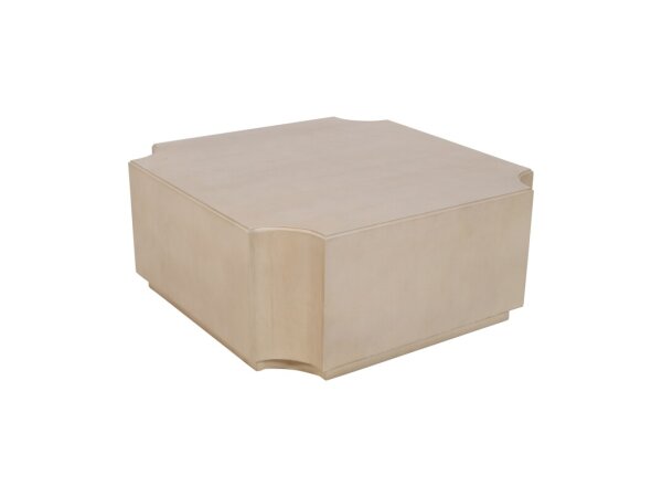 Round cocktail table in light Diamond oak veneer with a warm pewter metal-wrapped base band and matched veneer top, finished on all sides. Measures 60 in. round x 18 in. high.