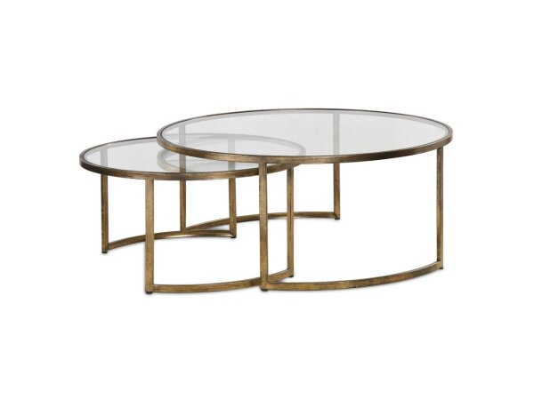Round cocktail table in dark Mink oak veneer with a warm pewter metal-wrapped base band and matched veneer top, finished on all sides. Measures 60 in. round x 18 in. high.