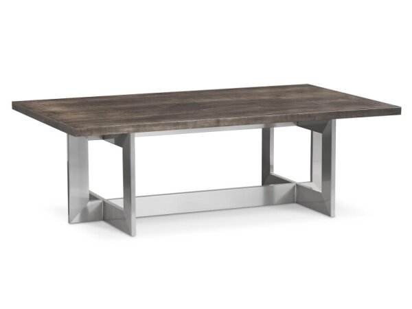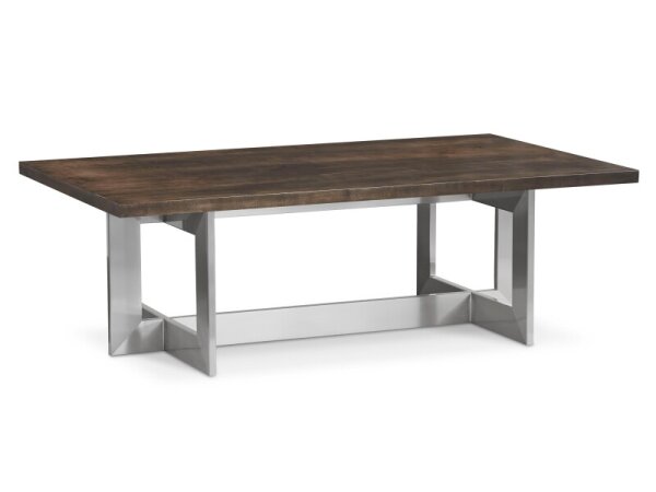 Hand-crafted cocktail table pairing a solid American maple top with a brushed stainless metal base and levelers for even placement. 52 in. W x 30 in. D x 17 in. H.