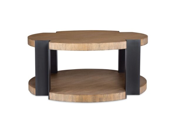 This Wallace cocktail table is crafted from Rubberwood solids and Oak veneers with an Aged Oak finish. It features two-sided lift tops for hidden storage, open shelving for display, and casters for easy mobility.