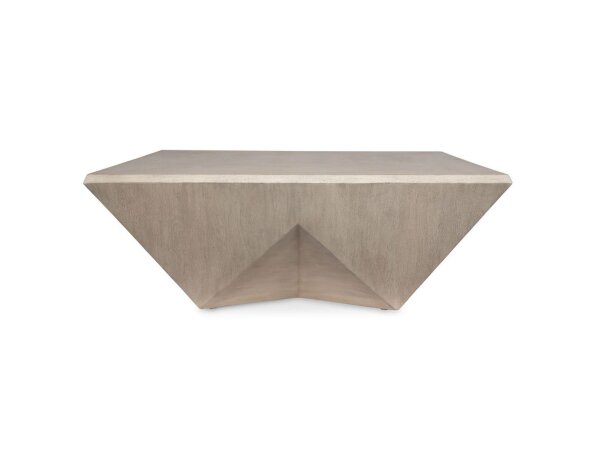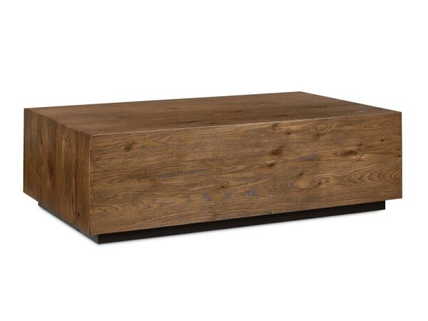 Rectangular cocktail table with rustic white oak veneers aligned for a waterfall grain effect over a solid wood plinth base. Optional casters available.