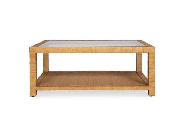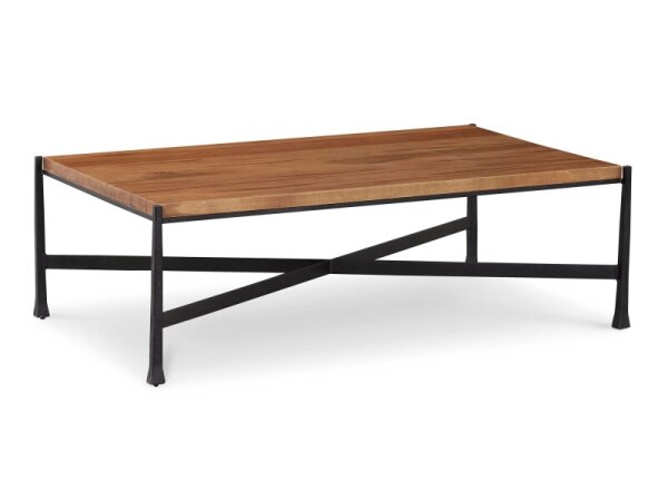 Rectangular cocktail table with a 1.25 in. Appalachian maple top and a powder-coated cast iron base with levelers. Measures 50 in. W x 30 in. D x 17.5 in. H.