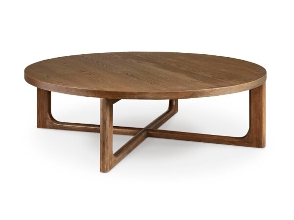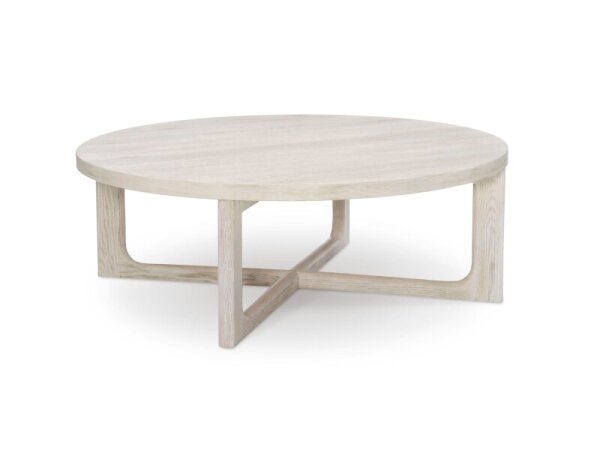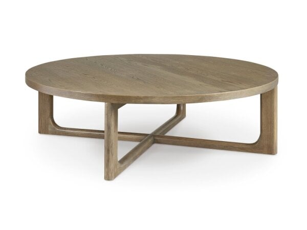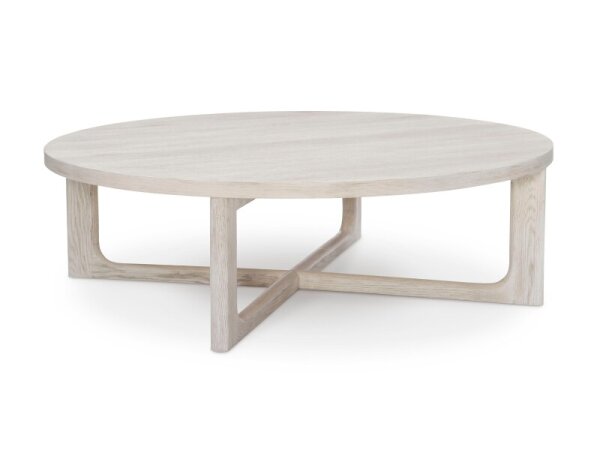 Round cocktail table featuring an x-shaped design and raw oak grain. Made of solid hardwood; 48 in. diameter, 16 in. high.