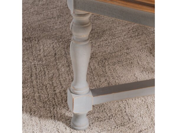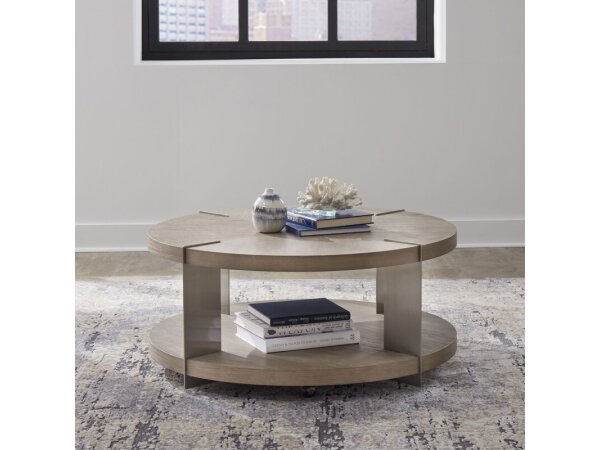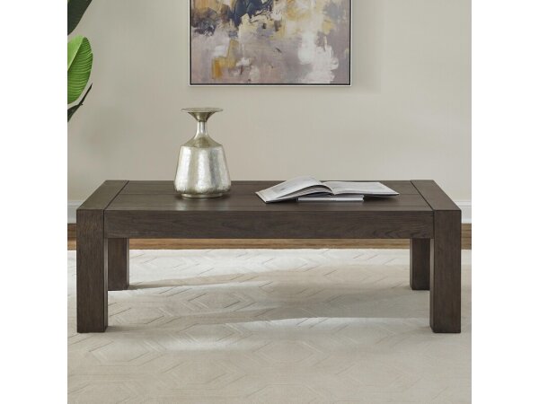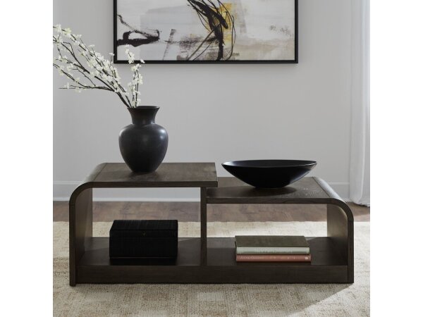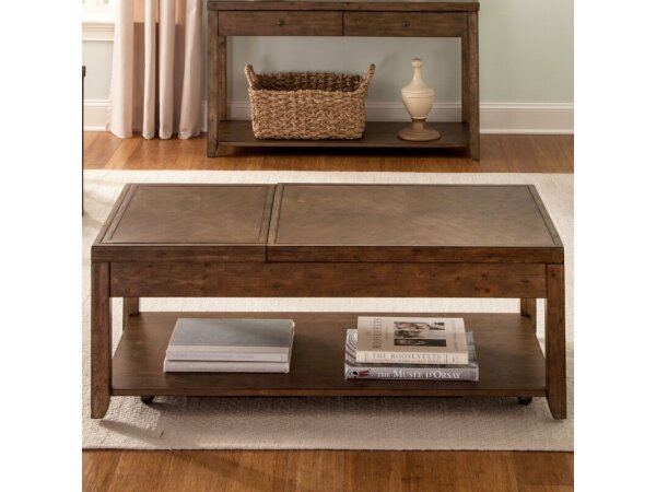 This multi-functional cocktail table, made from poplar solids and cedar veneers with a nutmeg finish, features a lift top and a flip top revealing an upholstered seat. It also includes a pull-out drink shelf, a bottom shelf for storage, and casters for ea