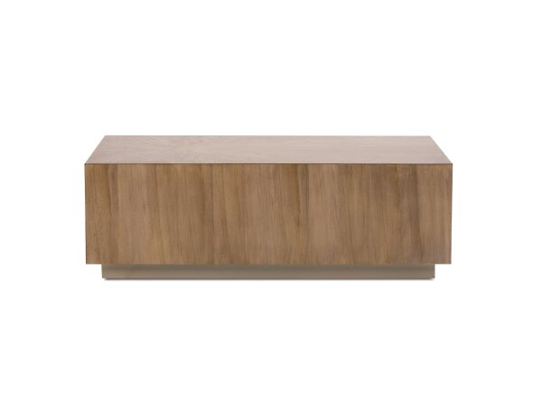 Irregularly reeded, vertical oak tambour covers the sides and softened corners of our Andora Rectangular Plinth Cocktail Table. This Modernist-inspired nod to 1970s sophistication provides a substantial occasional table whose large surface seems to float