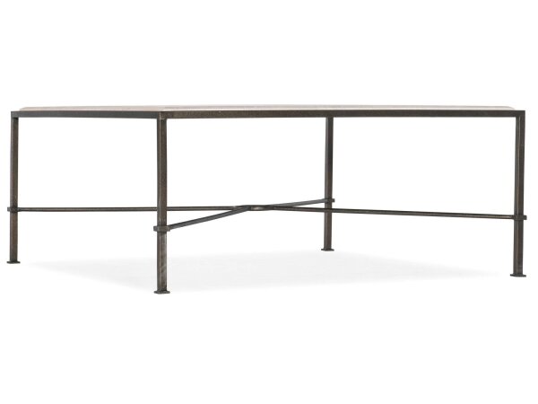 Cocktail table with a dark charcoal textured metal frame and X-stretcher topped by a creamy beige marble slab. A versatile coffee table that blends easily with transitional decor.