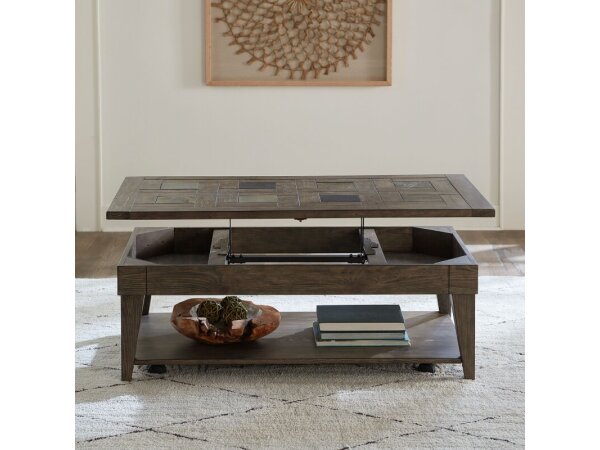 This rustic lift top cocktail table is crafted from solid reclaimed pine with a weathered stone finish and slate tile inserts. It features a lift-top that reveals hidden storage, a bottom shelf, and casters for easy movement.
