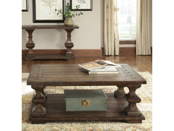 This Spanish style Sedona cocktail table is crafted from rubberwood solids and oak veneers with a Kona brown finish. It features a planked top with square peg accents, a bottom shelf for storage, and Spanish style turned legs with casters.
