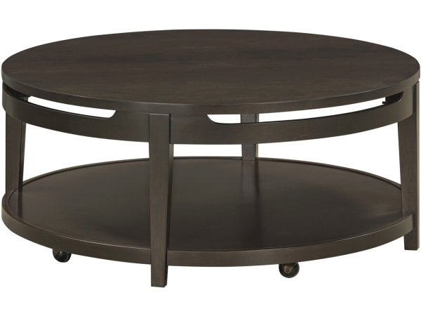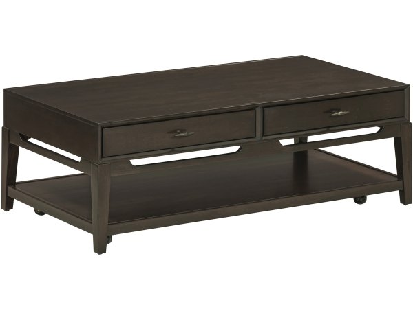 This cocktail table is crafted from pine solids and veneers with a distressed two-tone Riverstone White and Tobacco finish. It features a full extension drawer, an open bottom shelf, and casters for easy mobility.