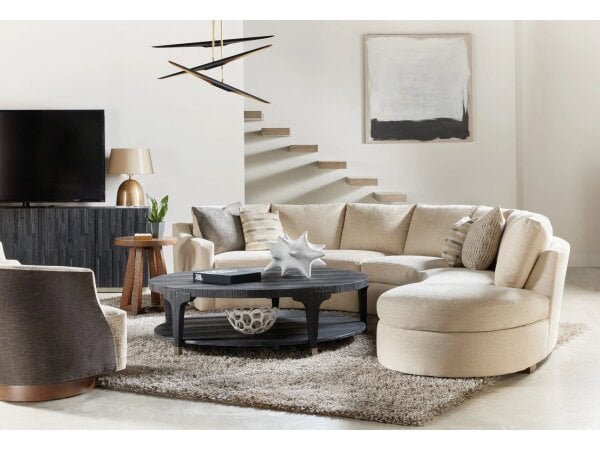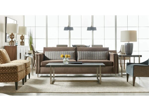 This Sutton cocktail table is crafted from poplar solids and birch veneers with a Bleached Sand finish, featuring a polished metal trim. It includes an inset wood top, an open bottom shelf for storage, and casters for easy movement.