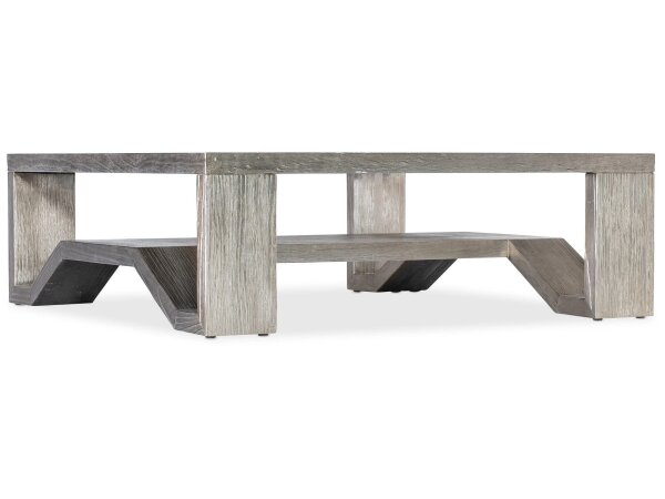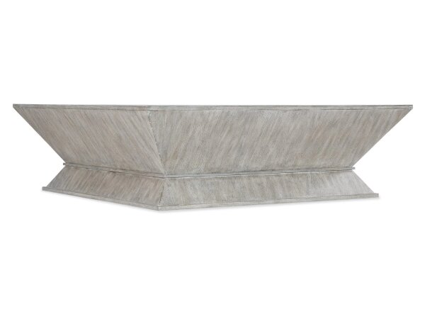 This modern cocktail table makes a bold statement with a large faux concrete block base and an offset, layered wood top. Crafted from Rubberwood solids and White Oak veneers, its sculptural silhouette adds depth to any living space.