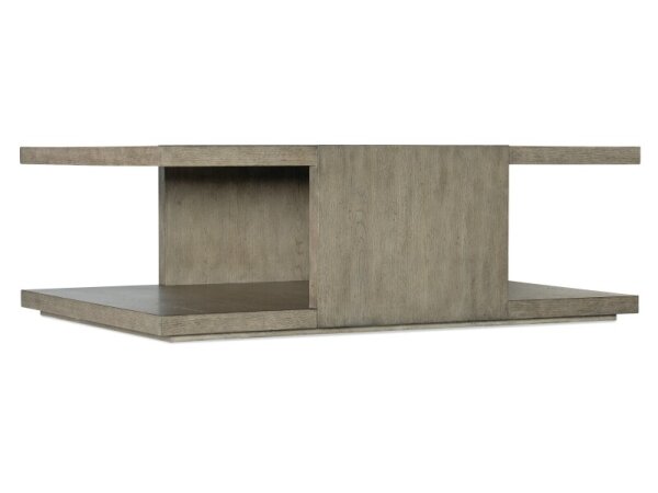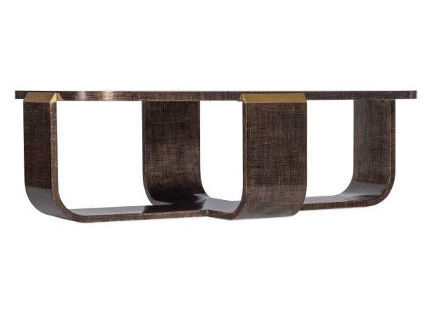 Enhance your space with this classic rectangular cocktail table, crafted from poplar solids and birch veneers with a cordovian brown finish. It features a bottom shelf for storage, casters, walnut inlay, and X metal accents.