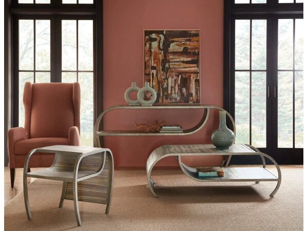 This rectangular cocktail table features casters for easy mobility and an open bottom shelf for storage or display. Its design is characterized by wide legs and soft, rounded shaping.
