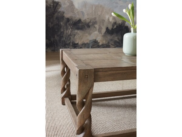 This contemporary farmhouse coffee table showcases expert craftsmanship with its solid mahogany construction and cerused wheat finish. The table’s smooth
