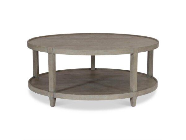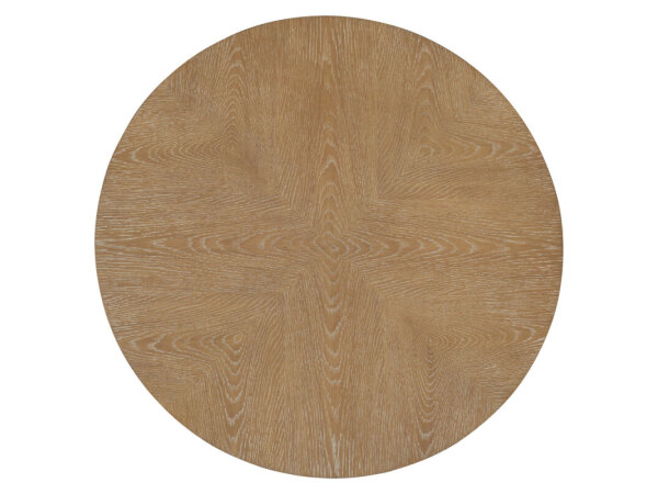 Round cocktail table with a light rustic acacia top and minimalist metal base with spherical stretchers. A character-rich coffee table for modern transitional spaces.