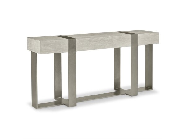 Slim console table at 14 in. deep fits small spaces and doubles as a bookcase or display table. Oak veneers in a soft taupe Terrain finish bring a calm, transitional look.
