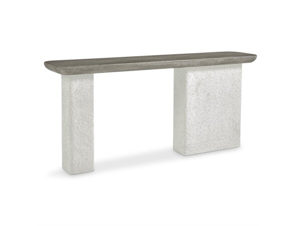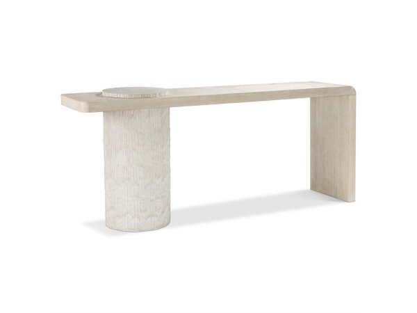 Modern console table in a textured alabaster plaster white finish over wood veneers, with an open storage area and clean rectangular lines. A refined accent for contemporary living spaces.