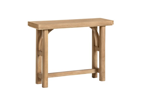 Console table of quartered oak veneers in a light Diamond finish with metal-wrapped leg bands and rounded edges, finished on all sides. Slim profile at 16.25 in. deep suits tight spaces.