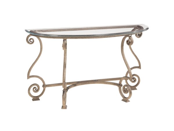 The Heatherbrook console bar table, crafted from poplar solids and acacia veneers with a charcoal and ash finish, includes two electrical outlets and USB ports for charging. It also features open grid end panels and a block leg design, fitting well behind
