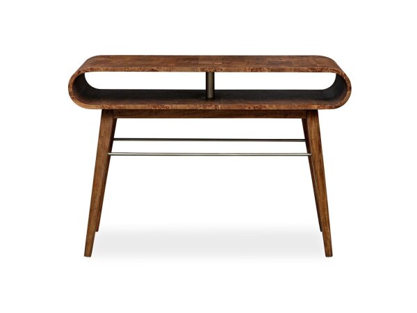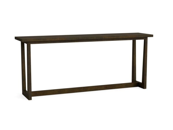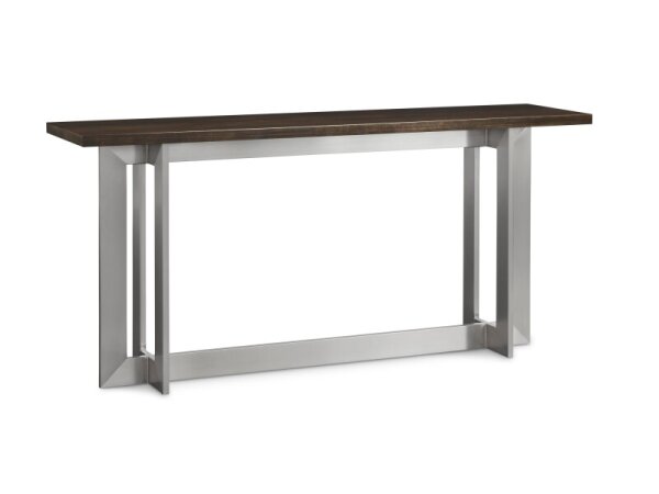 The Heatherbrook console bar table, crafted from poplar solids and acacia veneers with a charcoal and ash finish, includes two electrical outlets and USB ports for charging. It also features open grid end panels and a block leg design, fitting well behind