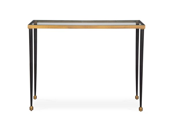 Console table featuring a 1.25 in. thick Appalachian maple top and a textured cast-iron X-base in dark ebony. Hidden levelers ensure stable footing in hallways or behind a sofa.