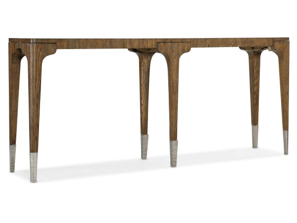 Slim Art Deco–inspired console table in warm Sorrel white oak with forged pewter ferrules. Narrow 16.25 in. depth adds versatility in tight spaces.