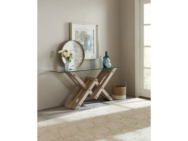 Accent console with an angular base accented by wood pegs and a removable glass top. Finished in greige sand-blasted quartered oak veneers.