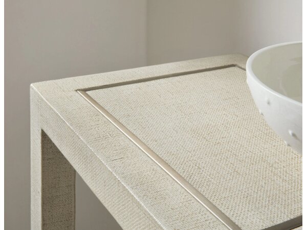 Lacquered burlap console table with subtle metal inlay, 16 in. deep for tight spaces. Cubby-like storage with one fixed shelf adds organized display.